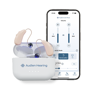 Audien Hearing Atom 2 hearing aids with open charging case showing one device elevated